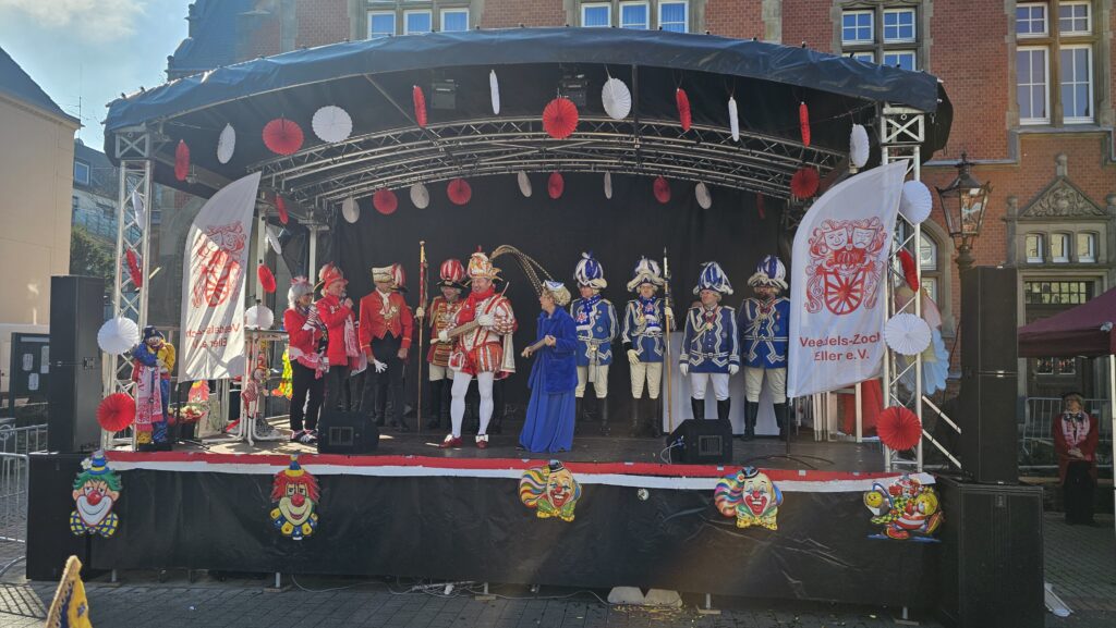 Auf dem ersten Foto (Danke @ Ddorf-Aktuell.de) seht ihr einen Moment, der den Tag gut einfängt: links unser Vorsitzender Frank Müller, in der Mitte unsere Schirmherrin der Session Claudia Albes und rechts unsere Hoppeditzin Ute Ast – jeck, herzlich und mit frischen Blumen im Arm.
