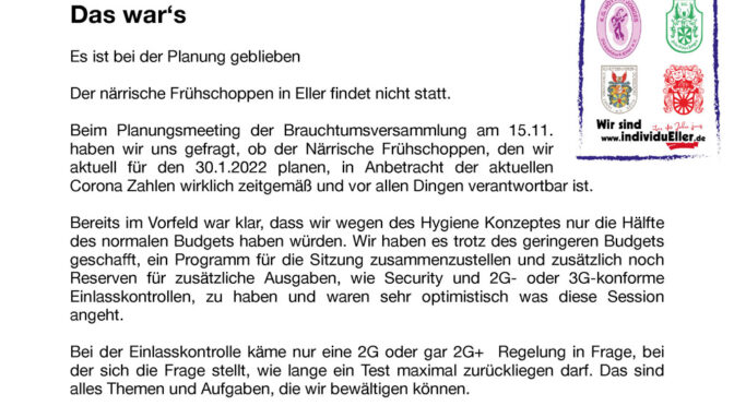 Der närrische Frühschoppen in Eller findet nicht statt. Beim Planungsmeeting der Brauchtumsversammlung am 15.11. haben wir uns gefragt, ob der Närrische Frühschoppen, den wir aktuell für den 30.1.2022 planen, in Anbetracht der aktuellen Corona Zahlen wirklich zeitgemäß und vor allen Dingen verantwortbar ist.