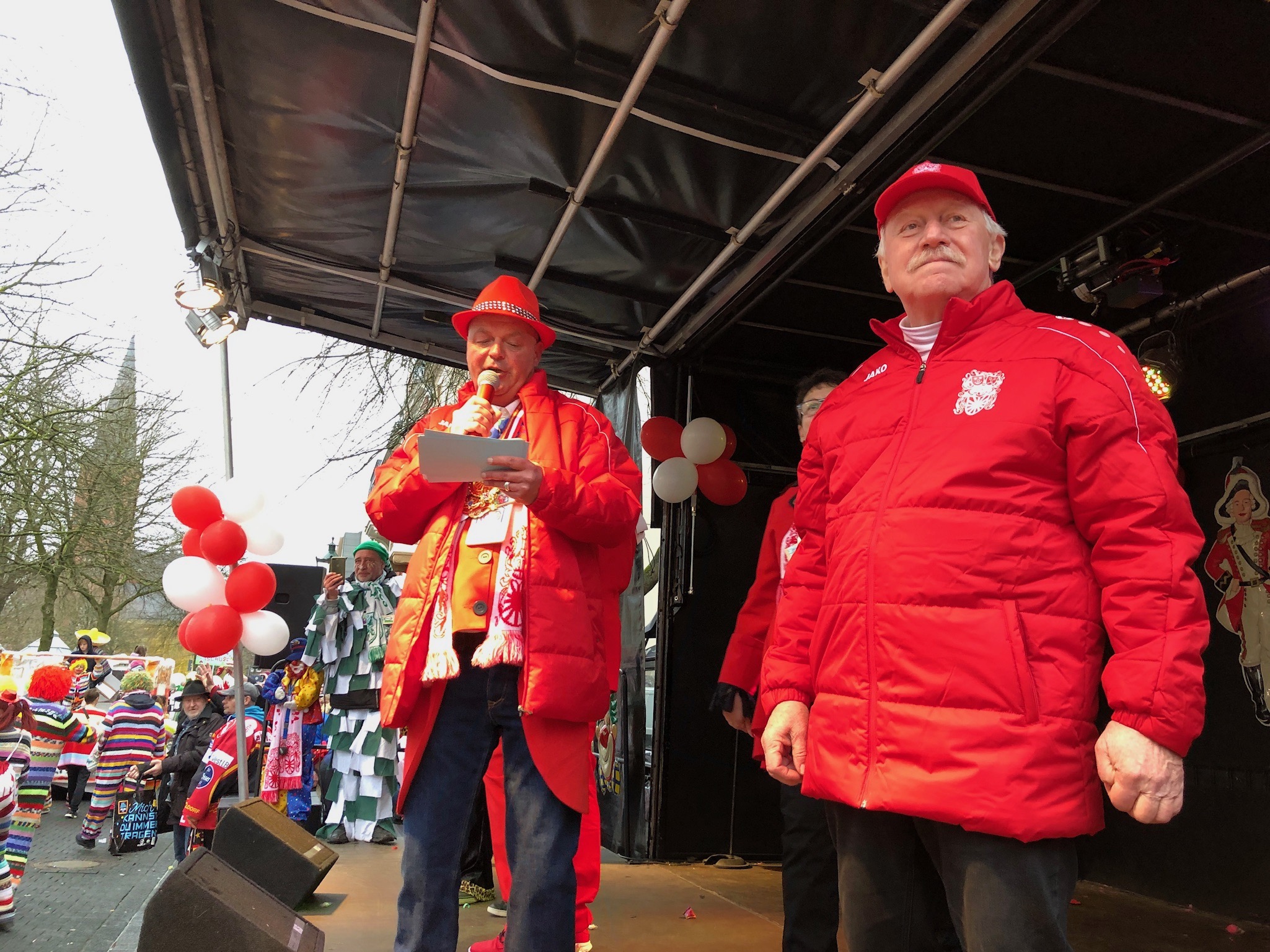 Bereits ab 12:11 Uhr begann auf dem Gertrudisplatz das traditionelle Biwak. Bei bester Stimmung sorgte die Wimmer Band für musikalische Highlights und stimmte auf den herannahenden Zoch ein, animierte das Publikum zum Mitsingen und Tanzen. Ein besonderer Höhepunkt war der Besuch des Düsseldorfer Prinzenpaares, Prinz Andreas I. und Venetia Evelyn, die mit ihrer Anwesenheit das närrische Treiben bereicherten. Für das leibliche Wohl war ebenfalls bestens gesorgt: Frisch gezapftes Schlüssel Alt und diverse kulinarische Angebote rundeten das Fest ab. Unser Gründungsmitglied und diesjähriger Schirmherr Dieter Stammler erhielt zum 80-jährigen nicht nur ein Ständchen des gesamtes Gertrudisplatzes, sondern gleich auch noch den Orden des Prinzenpaares verliehen.